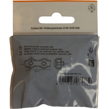 Wil je een draad doeltreffend blokkeren en vastklemmen? Dat maakt de draadklem duplex 4 mm 2 stuks mogelijk. Met deze klem creëer je snel en eenvoudig een verbinding die je later ook makkelijk kunt verwijderen. Deze draadklem is geschikt voor dunne touwen en kabels van 4mm. Doordat de klem gemaakt is van verzinkt metaal, is hij goed bestand tegen corrosie wat de levensduur van de draad verlengd. Deze draadklem wordt verkocht per set van 2 stuks, dus je hebt altijd een extra klem op voorraad. Kortom: met deze draadklem zorg je ervoor je staaldraad niet losschiet.