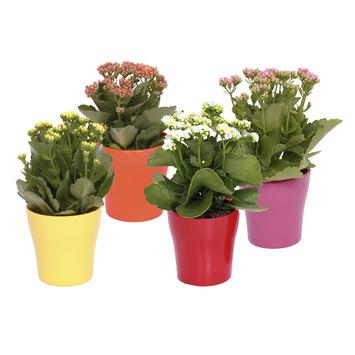 De Kalanchoë mix bestaat uit 4 Kalanchoë in 4 vrolijke kleuren: rose, rood, geel en oranje. De Kalanchoë is een leuk vetplantje met hele jaar rond fris bloeiende bloemen. Deze variant, de Rosalina, heeft veel kleine bloemetjes bij elkaar. Elke plant heeft zijn eigen gekleurde pot. De plantjes zijn 28 centimeter hoog, inclusief (keramieken) bloempot. De potten hebben een diameter van 13 centimeter. De Kalanchoë is een supersterk vetplantje dat absoluut tegen een stootje kan. Verzorgingtips voor de Kalanchoë? Zet de Kalanchoë in de zon om de kleuren van de bloemen helder en sprankelend te houden. De Kalanchoë heeft niet veel water nodig. Een keer in de week is genoeg. De Kalanchoë is een sterk vetplantje dat goed voor zichzelf kan zorgen. Deze planten kunnen prima buiten staan, zolang het maar niet vriest.