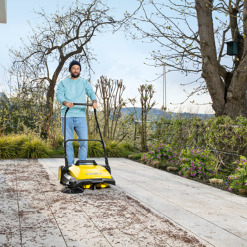 Of het nu lente, zomer, herfst of winter is, de nieuwe Kärcher S 6 veegmachine is ideaal voor het hele jaar door schoonmaken rondom het huis en in de tuin. Dankzij de krachtige rolborstel, zijborstel en een totale veegbreedte van 670 mm, veegt het apparaat moeiteloos gebieden tot 2500 m² per uur. De ergonomische duwhandgreep kan zonder bukken op twee posities worden ingesteld en optimaal worden aangepast aan de hoogte van de gebruiker. Het afval wordt direct in de 38-liter afvalcontainer verzameld, waardoor je geen vuile handen krijgt bij het legen. Een extra pluspunt is de hoogte-instelling van de zijborstel, waarmee je de contactdruk met het afval kunt aanpassen voor optimale veegresultaten. De S 6 kan volledig worden ingeklapt dankzij een voetplaat aan het frame en ruimtebesparend worden opgeborgen. Bovendien is de veegmachine snel klaar voor gebruik dankzij de gereedschaploze installatie van de zijborstel.