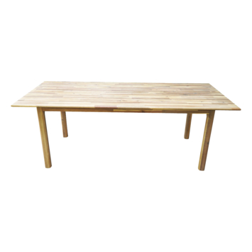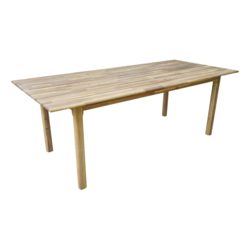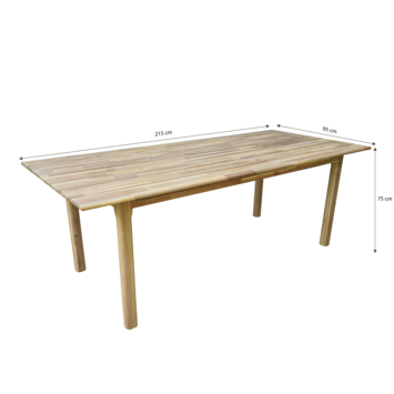 Met een lengte van 95 cm en een breedte van 215 cm biedt de tafel voldoende ruimte voor een groot gezelschap. Het natuurlijke teak design voegt een warme sfeer toe aan je buitenruimte, terwijl het robuuste materiaal zorgt voor een lange levensduur. De tafel is bestand tegen verschillende weersomstandigheden, zodat je hem het hele jaar door kunt gebruiken zonder je zorgen te maken over slijtage.