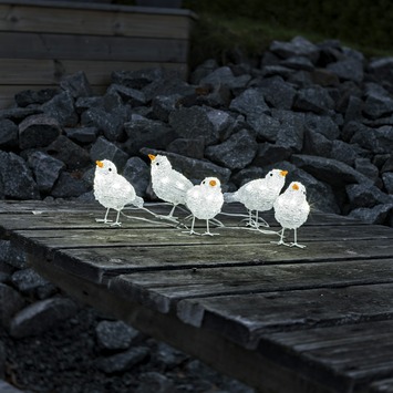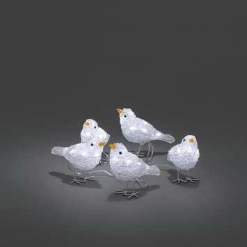 Haal de kerstsfeer in huis met de kerstdecoratie van GAMMA. Deze kerstverlichting bestaat uit 5 acryl vogeltjes van het Zweese merk Konstsmide. De 5 vogels hangen vast aan een snoer en hebben telkens een tussenafstand van 1m en een aansluitsnoer van 5m. De 40 koelwitte LEDjes zorgen voor voldoende licht in de donkere dagen. Geschikt voor buitengebruik.