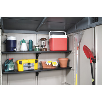 De accessoireset van Keter is handig om meer opbergruimte in je Factor tuinhuis te creëren. De set bestaat uit een kunststof plank en twee gereedschaphouders. De lengte van de plank is 196 cm.