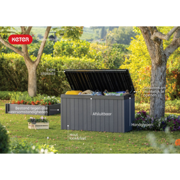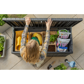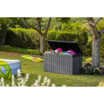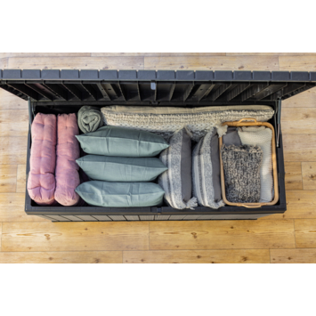De Keter Darwin opbergbox tuin antraciet 570 liter is een praktische opbergbox voor tuinkussens, speelgoed en gereedschap. Met een inhoud van 570 liter heb je voldoende plaats om spullen netjes op te bergen. Zo blijft je terras of tuin overzichtelijk.