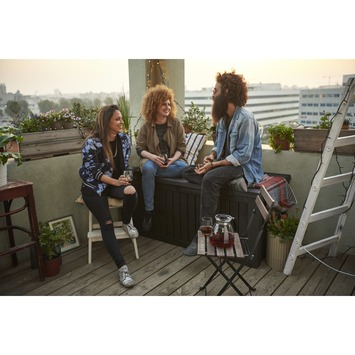 De kussenbox Rockwood van Keter is gemaakt van kunststof en aluminium en is regenwaterdicht. Je kan de box dus buiten laten staan zonder dat de inhoud nat wordt. De box is stevig genoeg om zitruimte voor 2 personen toe te laten. De kussenbox Rockwood van Keter is 155 cm lang, 72 cm breed en 64 cm hoog, wat op een volume van 570 liter neerkomt. Deze designbox met houtnerf is eenvoudig te monteren en heeft een automatisch openingssysteem. De Keter kussenbox Rockwood is dus de ideale aanvulling in jouw tuin.
