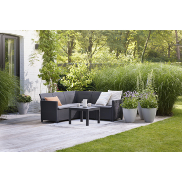 De Marie 5-zits hoek loungeset is compact, comfortabel en ideaal voor elke tuin. De set bestaat uit een ruime loungebank voor vijf personen en een handige bijzettafel. Je zet 'm eenvoudig zelf in elkaar dankzij het slimme kliksysteem – geen gereedschap nodig. De set is gemaakt van lichtgewicht kunststof, dus je verplaatst alles makkelijk als je zin hebt in een nieuwe opstelling. Schoonmaken? Gewoon even afnemen. De wicker/rattan look geeft een gezellige uitstraling, en met de meegeleverde zitkussens zit je er ook nog eens heerlijk bij. Klaar voor relaxte dagen in de zon!