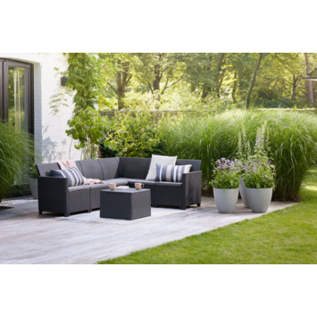 De Keter Marie Hoek Loungeset is meer dan een simpele plek om te zitten. Met zijn eigentijdse wickerdesign voegt deze set een vleugje klasse toe aan elke buitenruimte. De grijze kleur en strakke lijnen zorgen voor een moderne uitstraling die perfect past bij diverse buitendecors. Deze loungeset is niet alleen stijlvol, maar ook ontzettend functioneel. De royale 6-zits hoekbank biedt ruimte aan uzelf en uw gasten om te ontspannen en te genieten van het buitenleven. De bijgeleverde Luzon opbergtafel is niet alleen praktisch, maar biedt ook extra opbergruimte voor uw tuinspullen. De zachte zitkussens verhogen het comfort aanzienlijk, waardoor u optimaal kunt genieten van lange, zwoele zomerdagen. Gemaakt van hoogwaardig kunststof, is de Keter Marie Hoek Loungeset bestand tegen alle weersomstandigheden. Het materiaal is niet alleen weerbestendig, maar ook eenvoudig schoon te maken. Hierdoor heeft u jarenlang plezier van deze prachtige loungeset, zonder veel onderhoud.