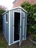 Kunstof tuinhuisje waar je veel spullen in kwijt kunt.
