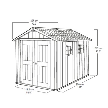 De buitenafmeting (B x D x H) is 229 x 350 cm x 242 cm, de binnenafmeting is (B x D x H) 201 x 324 x 230 cm. Kortom, met de koop van deze prachtige Keter Oakland 7511 tuinhuis heb je op betaalbare wijze een onverwoestbare en praktische extra opbergruimte in je tuin die je ook nog eens kan schilderen in iedere kleur die je maar wil.