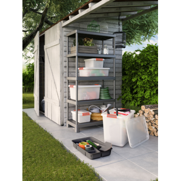Deze Keter Plus opbergplank van 90 cm breedte, gemaakt van kunsthars, heeft 5 opbergplanken. Het is aanpasbaar en kan zowel horizontaal als verticaal gemonteerd worden. De montage is eenvoudig en vereist geen gereedschap. De maximale belasting is 55 kg per plank. Voor extra stabiliteit wordt aanbevolen om de opbergplank aan de muur te bevestigen.