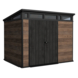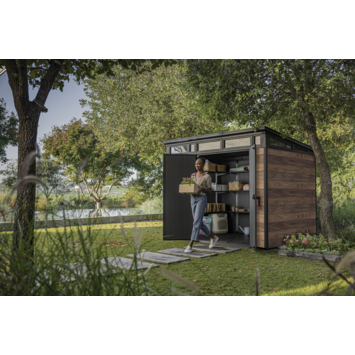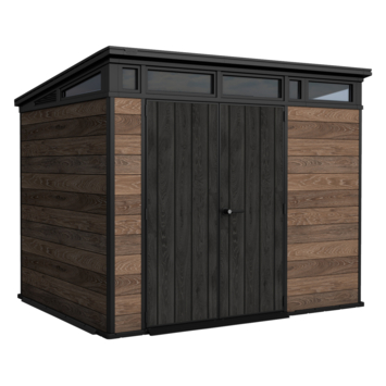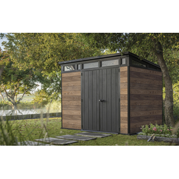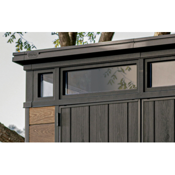 Het Keter Signature PENT 97 tuinhuis 279 x 216 x 226 cm heeft een modern ontwerp met een schuin dak en een horizontale ramenstrook bovenaan. Dat geeft het een eigentijdse uitstraling die mooi aansluit bij een hedendaagse tuin. De wanden zijn uitgevoerd in DECoCOAT, een kunststof met zichtbare en voelbare houtnerf. Zo krijg je de uitstraling van hout zonder het onderhoud dat daarbij hoort.