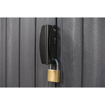 De openslaande deuren zorgen voor een gemakkelijke toegang tot de opbergruimte. Het stevige vloerpaneel maakt het mogelijk om zwaardere items, zoals barbecues en tuingereedschap, op te slaan. De deuren kunnen worden afgesloten met een slot (niet inbegrepen) voor extra veiligheid.