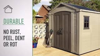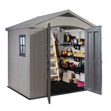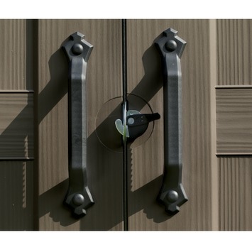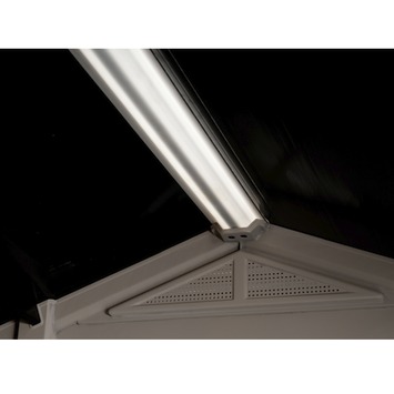 Een extra opslagplek nodig in je tuin? Het Keter Factor 86 tuinhuis staat binnen een paar uur. Het kunststof huisje is stevig, slim ontworpen en onderhoudsvrij. Met een ruime inhoud berg je er moeiteloos grote spullen in op. Denk aan fietsen, tuingereedschap of meubels. De dubbele deuren openen wijd, en door de schuin aflopende vloer rijd je alles zo naar binnen. Het huisje heeft een bodemplaat die vuil en vocht buiten houdt. Dankzij het raam en het daklicht blijft de binnenkant aangenaam licht. De aluminium profielen zorgen voor extra stevigheid, ook bij slecht weer.