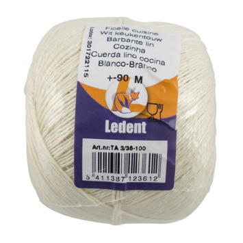 Een heerlijke rollade of gevulde kip klaarmaken? Gebruik dan speciaal keukentouw. Zo voorkom je vervelende situaties in de keuken. Dit keukentouw wit 90m is gemaakt van natuurlijk vlas en is geglansd, getorst en gebleekt. Hierdoor laat dit 100% natuurlijk product geen kleur of pluizen achter op het vlees. Het keukentouw is niet alleen geschikt als vleestouw, maar ook voor algemeen gebruik in de keuken. Daarnaast zijn er talloze andere toepassingen voor te bedenken. Zo kun je er bijvoorbeeld ook dozen mee dichtknopen, of takkenbossen bij elkaar binden. Kortom, keukentouw is een onmisbaar hulpmiddel in ieder huishouden.