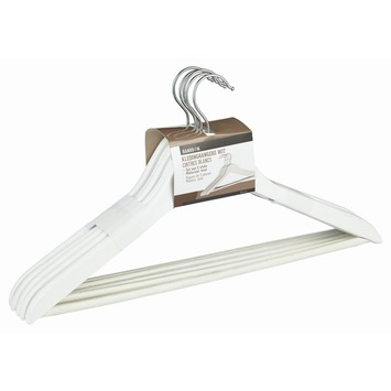 De Kledinghanger 5 stuks zijn vijf wit gelakte houten kledinghangers voorzien van een broeklat. De kledinghangers zorgen ervoor dat jouw kledingstukken altijd netjes uitgehangen zijn. De broeklat is enorm handig om een pantalon, broek, jeans of rok op te hangen.
