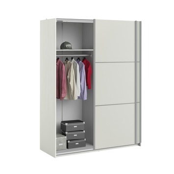 De garderobekast Janneke met de afmetingen (hxbxd) 202x152x64 cm is uitgevoerd in een witte houtnerf kleur. De kast heeft schuifdeuren en wordt standaard geleverd met 2 roedes voor een hanggedeelte en 2 legplanken. De kast is makkelijk te combineren met andere meubelen. Het interieur van de kast is uit te breiden met 3 legplanken en een ladenblok om de kast geheel naar eigen wens in te delen. Door uitbreiding met extra legplanken en/of een ladeblok creëer je meer opberggemak. Om de kast altijd zachtjes dicht te laten vallen, is er ook een softclose beschikbaar. Je kunt niet alleen je kamer naar eigen wens maken maar ook je kast. Perfect voor in elke kamer.
