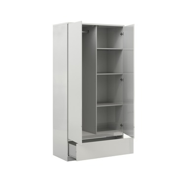 De garderobekast Nevada is de perfecte kast voor elke slaapkamer. De kast heeft een moderne uitstraling en is uitgevoerd in een hoogglans witte kleur. De greeploze deuren met een "push to open" systeem zorgen ervoor dat met een lichte druk de deur open gaat en maken hem helemaal af. De kast is uitgerust met 2 deuren, waarvan 1 hanggedeelte en de andere kant met 4 leggedeeltes. De afmetingen zijn (hxbxd) 200x99x50 cm. Kortom, de garderobekast Nevada is perfect voor in huis.