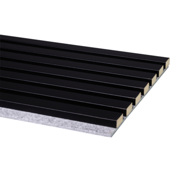 Met het kleurstaal van de lattenwand Decowall Acoustic zwart kan je thuis beoordelen of het wandpaneel past bij jouw huis en inrichting. Het kleurstaal hoort bij het paneel lattenwand 260x30cm (artikel 263625)