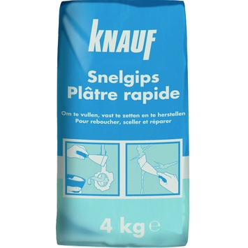 Het snelgips (4 kilogram) van Knauf is een snelhardende gips. Ideaal voor grote klussers met weinig tijd. Je kunt het gebruiken om haken en stroomdozen stevig vast te zetten, maar ook voor het dichten van scheuren en sleuven in muren. Dit snelgips is gemaakt voor binnengebruik.