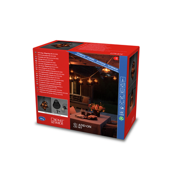 Maak het hele jaar door een geslaagd feestje van alle (buiten) activiteiten met dit stijlvolle en sfeervolle add-on feestverlichtingsnoer van het Zweedse premium merk Konstsmide. Dit 10 lamps en 10 m lange filament LED lichtsnoer heeft UV bestendige acryl transparante peertjes met zwarte decoratierasters en een prachtige extra warmwitte sfeervolle lichtkleur. Dit add on snoer kan uitsluitend worden gebruikt in combinatie met een Konstsmide startsnoer van 10 m lengte art. 212765. In totaal kunnen op 1 startsnoer maximaal 3x add-on snoeren van 10 m lengte van het type 2334-870 worden gekoppeld maximum van 40 m verlichte snoerlengte. De sfeervolle LED lichtbronnen zijn energiezuinig maar toch. Het snoer is bestand tegen extreme Scandinavische weersomstandigheden en doorstaat moeiteloos hoge en lage temperaturen. De transparante peertjes zijn zeer goed geïsoleerd tegen binnendringend water. De inhoud van de doos omvat geen trafo en aansluitsnoer. Deze maken deel uit van de inhoud van het startsnoer 2333. Wel is het snoer voorzien van speciale ophanghaakjes. Daardoor is het snoer eenvoudig op te hangen. Het snoer werkt op de IP44 goedgekeurde 24V buitentrafo van het startsnoer en is voorzien van een Europees veiligheidskeurmerk en daarmee volkomen veilig in gebruik. De LED-lichtbronnen gaan ten minste 20.000 uur mee, dat wil zeggen minimaal 20 jaar bij dagelijks gebruik van 3 uur. De LED-lichtbronnen zijn zeer kleurhomogeen, hebben minimaal verlies aan output gedurende de levensduur. De lichtbronnen zijn niet verwiselbaar, maar dat is gezien de lange levensduur ook niet nodig. Op de trafo van het startsnoer is een ingebouwde dimmer verwerkt waarmee ook de output van dit add on snoer op 100%, 75%, 50% of 25% kan worden ingeschakeld. De dimmer heeft een memoryfunctie dus na onderbreking van de stroomtoevoer hervat de dimmer met de laatst ingestelde dimmerstand. De dimmer is tevens de aan-/uitschakelaar. Dit mooie lichtsnoer is kwalitatief hoogwaardig en degelijk uitgevoerd. Konstsmide lichtsnoeren worden vervaardigd in een BSCI/SA8000 (Business Social Compliance Initiative) gecertificeerde productielocatie. Het snoer kan zowel binnen en buiten worden gebruikt en zorgt voor een gezellig, feestelijk tintje bij speciale gelegenheden als een barbecue, tuinfeest, WK/EK, examenfeest, verjaardag, jubileum, housewarming, huwelijksfeest, babyshower, kraamfeest en kan worden opgehangen in de tuin, terras, serre, partytent of aan balkon, pergola, parasol, voortent, luifel, erfafscheiding. In de winterperiode is dit snoer bij uitstek geschikt voor verlichting van bomen en struiken. De afstand tussen de lampen is 100 cm. Op 1 startsnoer van 10 m kunnen maximaal 3 add on snoeren worden gekoppeld dus je kunt een snoerlengte van 10, 20, 30 of 40 m kiezen. Met dit lichtsnoer van Konstsmide kies je voor premium kwaliteit en optimale sfeer!