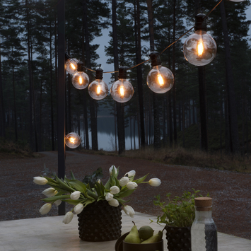 Maak het hele jaar door een feestje van alle (buiten) activiteiten met dit decoratieve, sfeervolle en zeer energiezuinige connectable feestverlichting verlengsnoer. Dit snoer kan uitsluitend als verlengsnoer op Konstsmide startsnoer 2394-800 worden gebruikt. Het startsnoer van 10 m lengte kan tot maximaal 40 m verlichte snoerlengte worden uitgebreid. Dit duurzame feestverlichting snoer van het Zweedse premium merk Konstsmide met 10 extra warmwitte filament LED acryl globes is 10 meter lang. Het snoer werkt op de bij het startsnoer 2394-800 geleverde trafo en kan gedimd worden met de dimmer op deze trafo. De LED lichtbronnen gaan ten minste 20.000 uur mee, dat wil zeggen minimaal 20 jaar bij dagelijks gebruik van 3 uur. De push in LED lampen zijn eenvoudig verwisselbaar maar dit is gezien de levensduur van de lampen normaal gesproken niet nodig. Op de trafo van dit lichtsnoer is een ingebouwde dimmer verwerkt waarmee de output van het snoer op 100%, 75%, 50%, 25% of 0% kan worden ingeschakeld. De dimmer heeft een memoryfunctie dus na onderbreking van de stroomtoevoer hervat de dimmer met de laatst ingestelde dimmerstand. Dit verlengsnoer is zeer energiezuinig en heeft energielabel A. Het lichtsnoer is kwalitatief hoogwaardig. Zelfs onder extreme Scandinavische weeromstandigheden blijft dit lichtsnoer probleemloos en duurzaam functioneren.