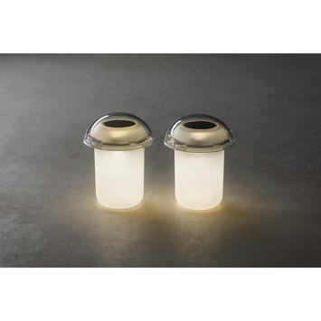 De Konstsmide LED solar tuinlampen Assisi zijn twee handige en energiezuinige sfeermakers die jouw tuin op zullen fleuren en verlichten, daar waar jij wilt. Doordat deze lampen oplaadbaar zijn door zonne-energie (geen aansluitsnoer nodig) zijn deze door middel van de grondspies eenvoudig te plaatsen op de gewenste plek. Deze witte solarlampen zijn gemaakt van wit en frosted kunststof. De lampen zijn voorzien van een geïntegreerde LED-lichtbron die je zelf in kunt stellen via een dipswitch. Kies voor een koelwitte setting of fleur je tuin op met een doorlopende rood-groen-blauwe kleurwissel. De lamp gaat bij een volle accu maximaal 8 uur mee.