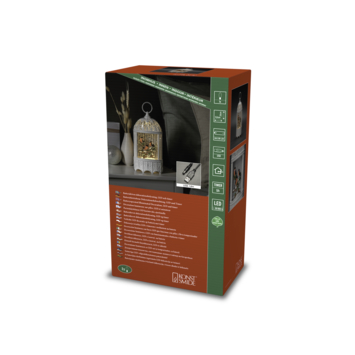 Met de KonstSmide sneeuwlantaarn vogelkooi goudvink met LED verlichting haal je een sprankelende kerstdecoratie in huis. De lantaarn is gevuld met water en glitters, waardoor een sneeuwachtig effect ontstaat rondom de drie vogeltjes in de boom. De LED verlichting kan ingesteld worden met de timer en geeft een gezellige, warme gloed. Dit product werkt op de meegeleverde USB-C kabel van 1,8 m of op 3 AA-batterijen, zodat je hem op diverse plekken kunt gebruiken.