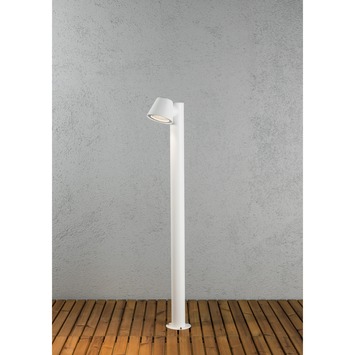 De Konstsmide Trieste staande lamp is gemaakt van aluminium gelakt in de kleur matwit. Deze moderne buitenlamp geeft een sfeervolle verlichting op je tuinpad of oprit. Maar ook als verlichting bij een vijver of zwembad staat dit tuinpaaltje zeer fraai. De sokkel is eenvoudig vast te zetten en de fitting is geschikt voor een GU10 lichtbron.