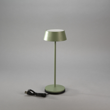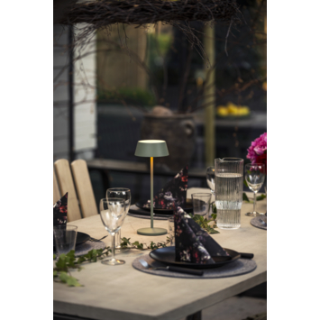 Met de KonstSmide tafellamp Menton 2,9W in groen haal je een praktische en stijlvolle LED-lamp in huis of buiten. De lamp is oplaadbaar via het meegeleverde oplaadstation en binnen ongeveer zes uur volledig opgeladen. De geïntegreerde LED van 2,9W is dimbaar en biedt twee lichttemperaturen: 2200K voor een warme uitstraling of 2700K voor een iets helderder licht. Zo kun je de verlichting altijd afstemmen op jouw gewenste sfeer.