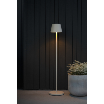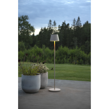 Met de KonstSmide Pomezia Medium vloerlamp 5W in zandkleur haal je een flexibele LED-lamp in huis of buiten. Je kunt kiezen uit twee lichtkleuren, 2200K voor een warme gloed of 2700K voor iets helderder licht. De lamp is dimbaar en de lichtsterkte pas je eenvoudig aan met de meegeleverde afstandsbediening, zodat je altijd de juiste sfeer creëert.