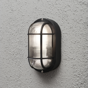 Veelzijdige en functionele ovaalvormige (20x12cm) wand- of plafondlamp voor binnen of buitengebruik. Door het grote geribbelde glasoppervlakte mooie en brede spreiding van licht. Het armatuur heeft een E27 fitting waar elke duurzame en ernergiezuinige lichtbron met E27 in kan worden verwerkt met een maximale lengte van 11cm en maximaal 40W. De lamp werkt op 230V netstroom en IP44 bescherming tegen stof en vocht. Kunststof frame is zwart.