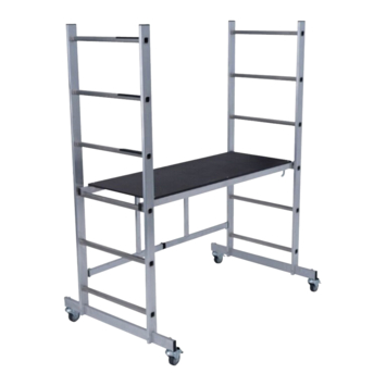 De makkelijk verplaatsbare aluminium vouwsteiger die zonder gereedschap op te zetten is voor incidenteel gebruik bij binnenwerkzaamheden. Lichtgewicht, compact met geremde zwenkwielen.