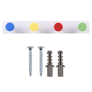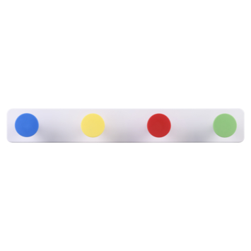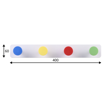Deze vrolijke kunststof kapstok fleurt elke ruimte op! De 40cm brede kapstok heeft 4 knoppen met een diameter van 4cm in de kleuren blauw, geel, rood en groen. Voldoende ruimte om je tas, jas en/of accessoires aan op te hangen. Geef iedere ruimte een speelse look met deze praktische en kleurrijke kapstok.