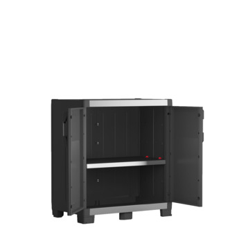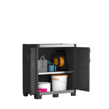 Een handige en solide opbergruimte. De XL PRO basiskast is een uiterst duurzame en solide opbergkast van bescheiden formaat. Hij heeft een stevige, schadebestendige constructie, versterkte planken die elk tot 45 kg kunnen dragen en verstelbare poten, waaronder een vijfde middenpoot voor stabiliteit. Hij is eenvoudig te monteren en heeft afsluitbare deuren.