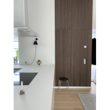 Met de lattenwand creeër je eenvoudig een scandinavisch stijlvol design in jouw huis. Met behulp van de kant en klare panelen kun je in een korte tijd een wand dichtzetten in woonkamer, keuken of slaapkamer en krijg je een warme uitstraling. Het paneel is 300 cm lang en 60,5 cm breed. De vilten achterwand, die gemaakt is van duurzame materialen zoals PET flessen, is zodanig afgewerkt dat er direct met een nieuw paneel verder gewerkt kan worden en de juiste afstand tussen de latten behouden blijft. Op het vilt zitten zwart gekleurde MDF latten die zijn voorzien van echt hout fineer. Iedere afzonderlijke lat is dus uniek. De lattenwand is in meerdere decoren beschikbaar. Het is belangrijk om bij het monteren van de panelen 2mm afstand te houden tussen de verschillende panelen. De vilten onderrug kan namelijk vanwege temperatuurverschillen lichtelijk uitzetten.