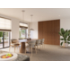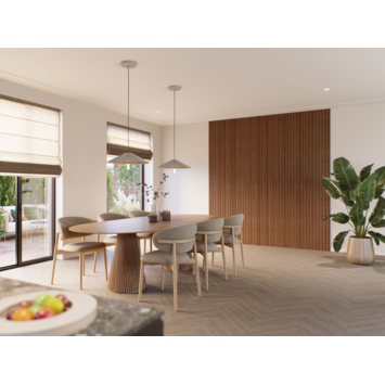 De ton-sur-ton lattenwand zorgt voor een verfijnde combinatie van houten latten en akoestisch vilt in perfect op elkaar afgestemde tinten. Dankzij het minimale kleurcontrast ontstaat een rustige, evenwichtige uitstraling die moeiteloos opgaat in elk interieur.