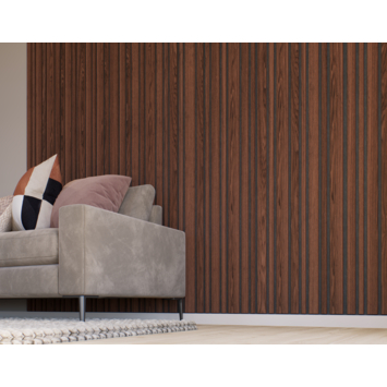 Met het kleurstaal van de lattenwand Decowall walnoot (artikel 348340) kan je thuis beoordelen of het wandpaneel past bij jouw huis en inrichting