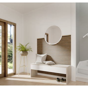 Met de CanDo green Decowall Acoustic creëer je snel en makkelijk een warme sfeer in huis. Door de achterzijde van vilt werkt de lattenwand bovendien geluidsabsorberend, waardoor de akoestiek in de ruimte verbetert. Het vilt is gemaakt van recyclede PET-flessen. Het hout is PEFC gecertificeerd en daarmee afkomstig uit duurzaam beheerde bossen. De panelen zijn kamerhoog (260 cm) en door het lichte gewicht makkelijk te vervoeren en hanteren. Ook het monteren is heel eenvoudig: de lattenwand kan op de muur gelijmd of geschroefd worden. Eén paneel is goed voor 30cm wand. Verpakt per 2 panelen. De MDF ommantelde lattenwanden zijn verkrijgbaar in verschillende decoren. Ook zijn eindprofielen beschikbaar om het product mooi af te werken. De eindprofielen zijn, net al de wandpanelen zelf, zowel horizontaal als verticaal te gebruiken.