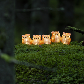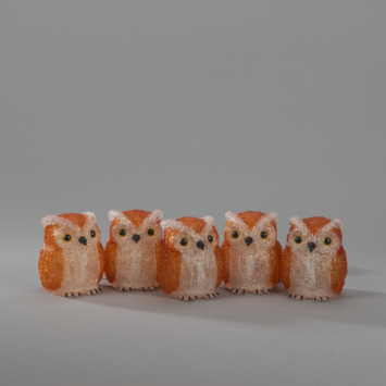 Met deze sfeervolle snoer met 5 acryl uilen in je buitenruimte steel je gegarandeerd de show. Plaats de prachtige verlichte uilen van Konstsmide in je tuin, op een tak of bij de voordeur en breng iedereen helemaal in feeststemming. De uilen worden elk verlicht door 8 warm witte LEDs en zijn onderling verbonden met een lichtsnoer van 1m. Het aansluitsnoer van dit lichtsnoer is 5 meter lang.