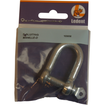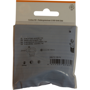 Sluiting in verzinkt staal in de vorm van een D met lengte 35 mm, dikte 10 mm en bekopening 20 mm. De D-sluiting wordt gebruikt voor het eenvoudig verbinden van koorden of kettingen. Ook eenvoudig en snel loskoppelen kan met deze sluiting. Per stuk in blister.