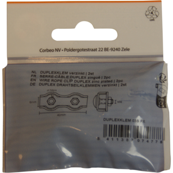 Dubbele klem laat toe om een draad doeltreffend te blokkeren en vast te klemmen met zekerheid. De draadklem maakt het mogelijk om snel en eenvoudig een wegneembare verbinding te creëren. Geschikt voor touw/kabel van 3 mm. Door de verzinking wordt corrosie voorkomen en de levensduur van de draadklem verlengd. Set van 2 stuks in blister.