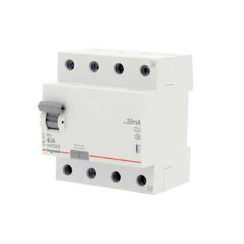 Deze vierpolige verliesstroomschakelaar of differentieelschakelaar is een automatisch werkende schakelaar die een elektrische installatie spanningsloos maakt zodra een lekstroom vanaf een bepaalde grootte optreedt. Op deze manier beschermt hij tegen elektrocutie.