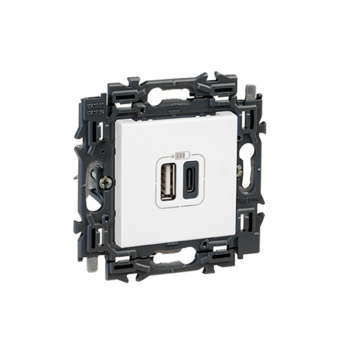 Deze witte inbouw contactdoos met spanklauwbevestiging uit de Valena Next reeks van Legrand is uitgerust met een type A en type C USB-poort. Op deze manier kan u snel verschillende mobiele apparaten opladen.