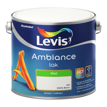 Levis Ambiance lak mat bestaat uit een reeks hoogkwalitatieve matte lakken op waterbasis. Door het bestanddeel polyurethaan is deze lak extreem krasvast. Daarnaast is deze lak in de kleur wit (2,5 liter) ook extra dekkend, sneldrogend en geur arm. Tot slot behoud de Levis Ambiance lak mat zijn kleur en is hij goed afwasbaar.