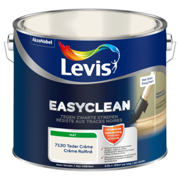 Levis Easyclean tegen zwarte strepen is een watergedragen verf met een uitstekende bescherming tegen zwarte strepen, vegen en stoten op uw muren van bijvoorbeeld: schoenen, tassen, stofzuigers, fietsen. Ideaal voor intensief gebruikte ruimtes! De verf spat niet, is geurarm, dekt goed en droogt egaal op voor een mooi mat eindresultaat.