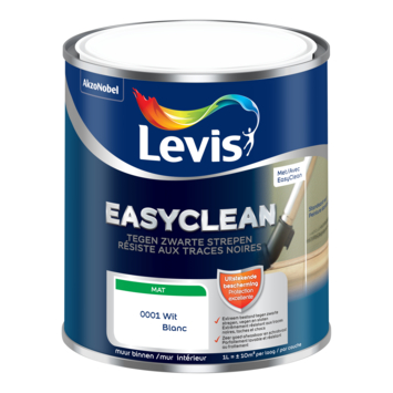 Levis Easyclean tegen zwarte strepen is een watergedragen verf met een uitstekende bescherming tegen zwarte strepen, vegen en stoten op uw muren van bijvoorbeeld: schoenen, tassen, stofzuigers, fietsen. Ideaal voor intensief gebruikte ruimtes! De verf spat niet, is geurarm, dekt goed en droogt egaal op voor een mooi mat eindresultaat.