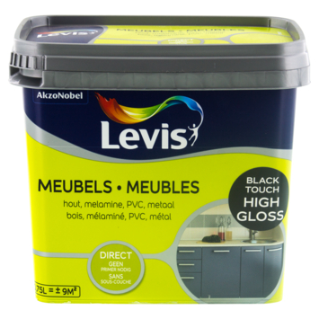 Een nieuw interieur, meubel of accessoire? Met de nieuwe Levis opfrisverf jaag je zo een frisse wind door je huis. Zonder al te veel moeite, want dankzij de unieke technologie achter deze 'opfrisverf' kan je verven zonder oude verflagen te verwijderen én zonder primer. Deze renovatieverf van Levis zorgt daarenboven voor een perfecte hechting en dekking op verschillende specifieke ondergronden: hout, melamine, pvc, metaal, ... Je interieur is zonder moeite herboren! Nu nog je kleur kiezen ... Wat dacht je van deze verf in de kleur hoogglans "zwart" (750 ml)?