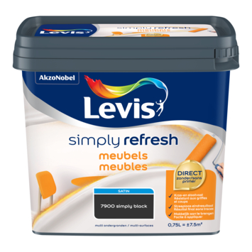 Levis Simply Refresh meubelverf satijn zwart 750 ml is een kwalitatieve verf op waterbasis. De meubelverf is toepasbaar zonder primer op verschillende ondergronden.