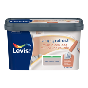 Levis Simply Refresh muurverf mat chalk 2 L is een kwalitatieve matte verf op waterbasis, die door zijn hoogdekkende formule dekt in 1 laag. Speciaal ontwikkeld voor reeds geschilderde binnenmuren.