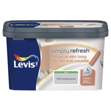 Levis Simply Refresh muurverf mat plume 2 L is een kwalitatieve matte verf op waterbasis, die door zijn hoogdekkende formule dekt in 1 laag. Speciaal ontwikkeld voor reeds geschilderde binnenmuren.
