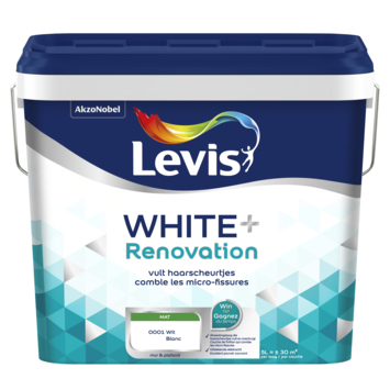 Levis White+ Renovation is een haarscheurvullende, matte renovatiemuurverf met microvezels op basis van een acrylaat bindmiddel. Speciaal voor binnenmuren en plafonds. Vult en overbrugt haarscheurtjes. Zeer hoog vulvermogen, waardoor haarscheurtjes makkelijk weggewerkt worden. Levis White+ Renovation is vochtregulerend, makkelijk aan te brengen, spat niet en is geurarm.